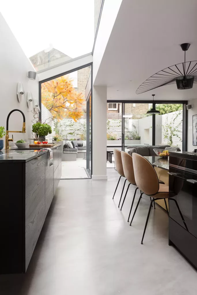 « Si opta por unidades de alto brillo, use madera natural en otras partes del esquema, en el piso, las encimeras o como otros elementos, para suavizar una sensación potencialmente clínica y ayudar a crear un entorno contemporáneo más adecuado para las familias. Inyecte color y textura cuando sea posible, con sofás de tela o tapizados para sillas de comedor.